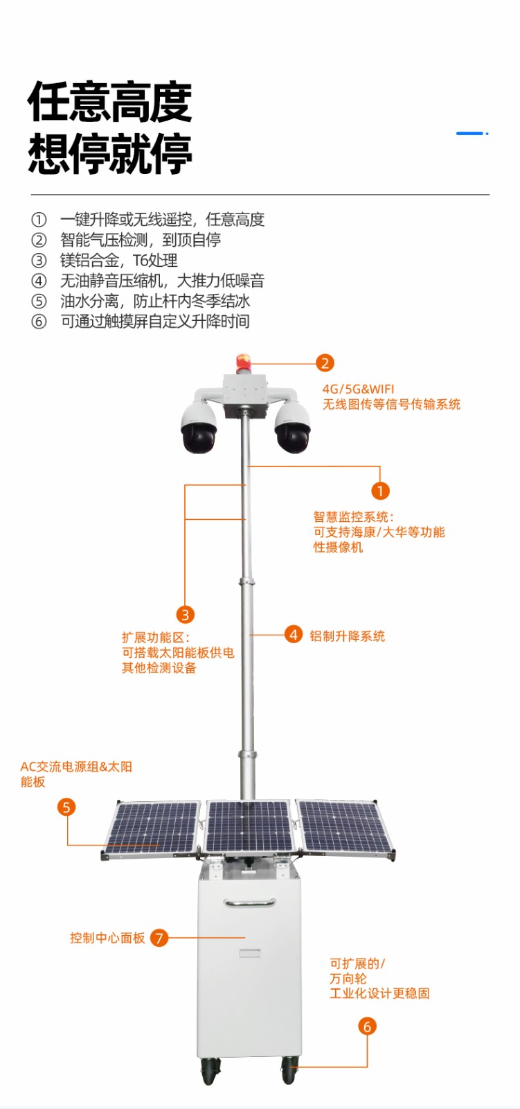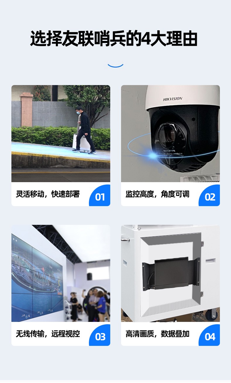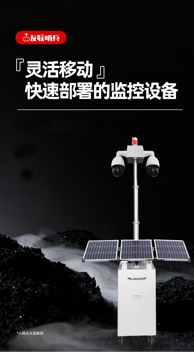 小哨兵移動監控系統太陽能電池供電超長續航便捷監控 友聯哨兵多功能移動兵站(輕便型小哨兵移動監控)是一款十分靈活的中小型移動監控設備,自帶網電,具備較高的機動性,系統可集高清視頻監控、照明、報警、廣播、對講、氣象環境監測、存儲、控制、無線傳輸、一鍵升降等功能于一體,并可具備市電、太陽能等多種能源補給方式,提升續航時間,以適應各類復雜的環境。戶外使用,不懼風雨,隨需移動,循環利用??蓮V泛用于石油管道巡檢、工地監控、電力維修監控、活動安防、戶外作業等臨時監控或長期監控。