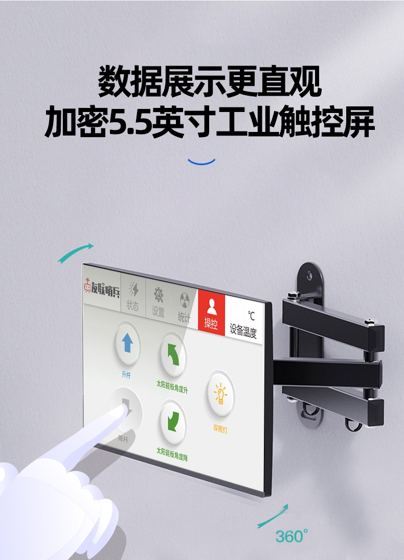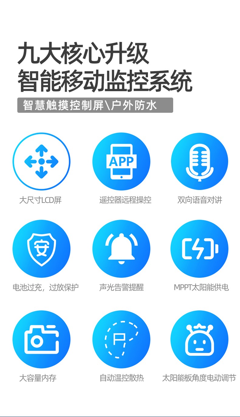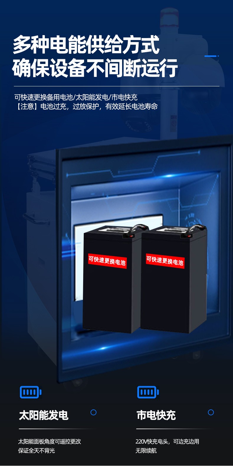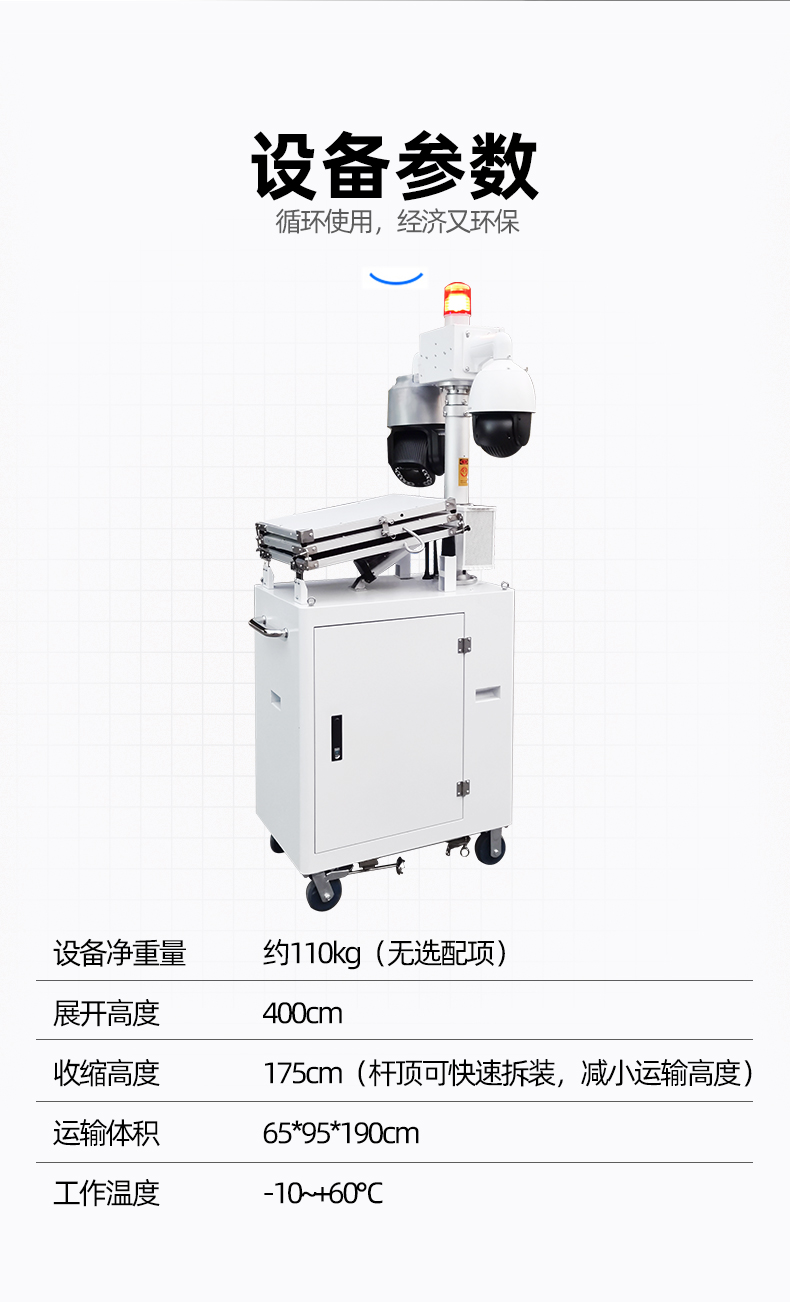 小哨兵移動監控系統太陽能電池供電超長續航便捷監控 友聯哨兵多功能移動兵站(輕便型小哨兵移動監控)是一款十分靈活的中小型移動監控設備,自帶網電,具備較高的機動性,系統可集高清視頻監控、照明、報警、廣播、對講、氣象環境監測、存儲、控制、無線傳輸、一鍵升降等功能于一體,并可具備市電、太陽能等多種能源補給方式,提升續航時間,以適應各類復雜的環境。戶外使用,不懼風雨,隨需移動,循環利用??蓮V泛用于石油管道巡檢、工地監控、電力維修監控、活動安防、戶外作業等臨時監控或長期監控。